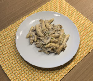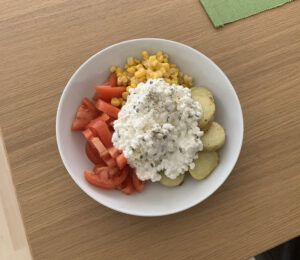 Kartoffeln würzen, Hüttenkäse, Peperoni, Ei und Mais beigeben und wenn notwendig, nochmals nachwürzen.